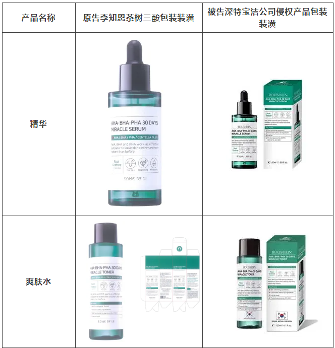 2021年原告委托乐球直播调查发现,被告汕头市深特宝洁实业有限公司生产、销售和推广的“茶树祛痘美白补水液”“茶树香皂”等护肤品,其产品包装装潢直接抄袭、摹仿原告前述已经具有较高知名度和影响力的“SOME BY MI/莎柏蜜”茶树三酸系列化妆品和黑蜗牛精华液的包装、装潢设计,使用与之近似的标识,造成消费者混淆误认。故原告作为茶树三酸、黑蜗牛精华包装装潢权益获益人,诉至广东省汕头市中级人民法院。汕头中院认定:李知恩主张的茶树三酸、黑蜗牛精华包装装潢构成具有一定影响的包装装潢,深特宝洁公司生产、销售茶树三酸、黑蜗牛精华液的行为构成不正当竞争。因判赔额不符合原告预期,原告后上诉至广东省高级人民法院,广东省高级人民法院最终维持一审判决。