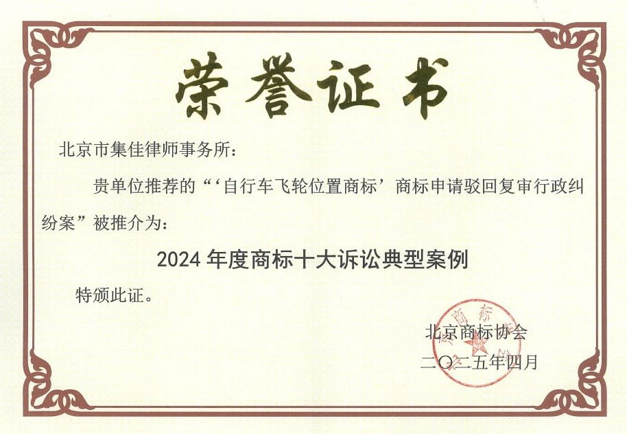 4月27日,北京商标协会发布2024年度北京商标十大诉讼典型案例,其中,集佳代理的斯拉姆有限责任公司(SRAM,LLC)诉国家知识产权局关于第G1729330号“自行车飞轮位置商标”商标申请驳回复审行政纠纷一案成功入选。