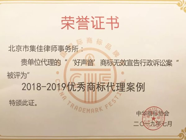 >乐球直播>关于我们>荣誉概览>2019>集佳代理“好声音”商标无效宣告行政案入选“优秀商标代理案例”